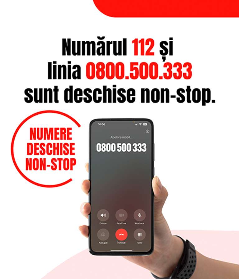 Numărul 112 și linia 0800.500.333 sunt deschise non-stop.